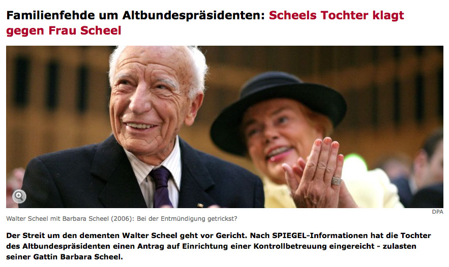 Um die Betreuung des demenzkranken Ex-Bundespräsidenten Walter Scheel ist eine Familienfehde entbrannt. Scheels Tochter Cornelia hat nach SPIEGEL-Informationen bei Gericht einen "Antrag auf Einrichtung einer Kontrollbetreuung" eingereicht. Sie will damit erreichen, dass Scheels Frau Barbara nicht mehr alle Entscheidungen für ihren Mann allein treffen kann.